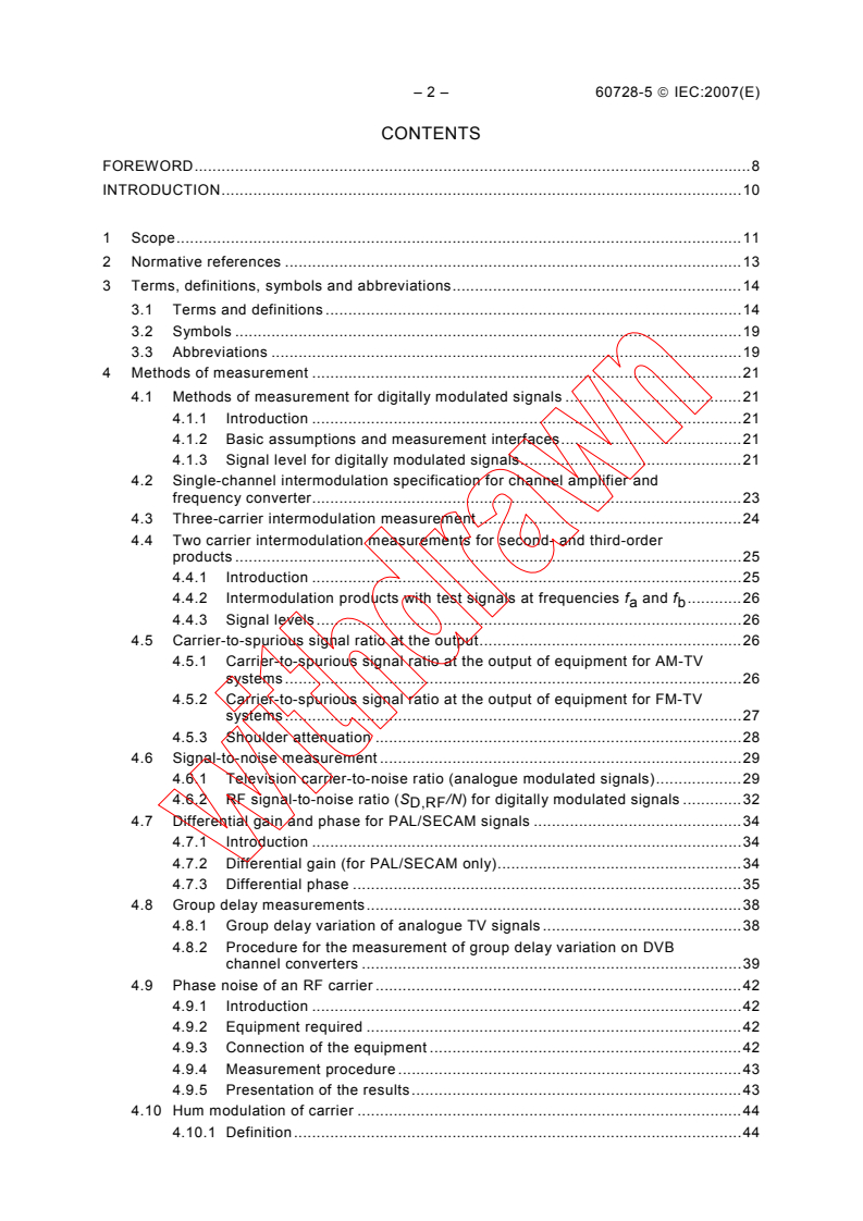 - Measurement methods (Clause 4): detailed procedures for digitally modulated signals (4.1), single-/multi-carrier intermodulation, carrier-to-spurious ratios, and RF signal-to-noise measurements (4.6.2).