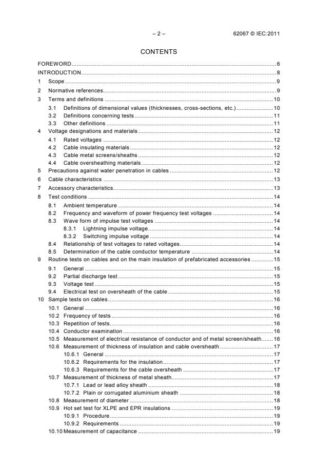 IEC 62067:2011 specifies test methods and requirements for power cable systems, cables with extruded insulation and their accessories for fixed installations, for rated voltages above 150 kV (Um = 170 kV) up to and including 500 kV (Um = 550 kV). The requirements apply to single-core cables and to their accessories for usual conditions of installation and operation, but not to special cables and their accessories, such as submarine cables, for which modifications to the standard tests may be necessary or special test conditions may need to be devised. This standard does not cover transition joints between cables with extruded insulation and paper insulated cables. The significant technical changes with respect to the previous edition are as follows: