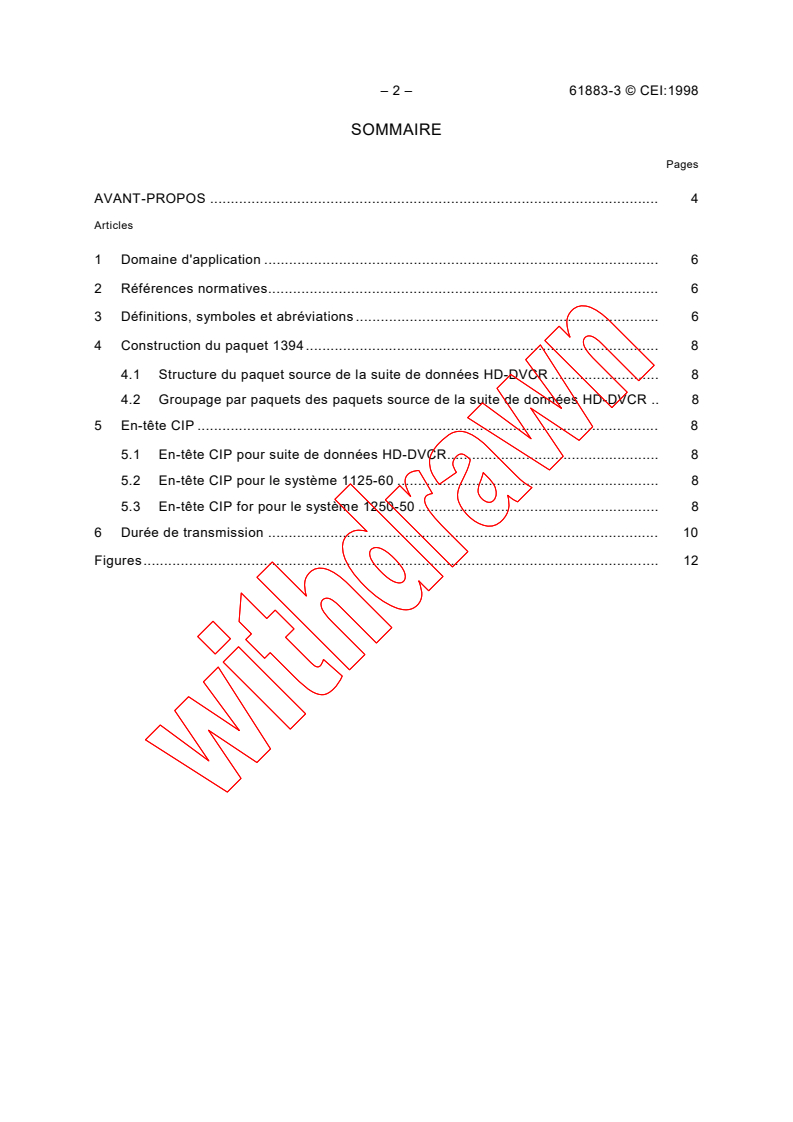 IEC 61883-3:1998 is an international standard developed by the International Electrotechnical Commission (IEC) that specifies digital interface requirements for HD-DVCR data transmission in consumer audio/video equipment. This standard focuses on the packet format and transmission timing for high-definition digital video cassette recorders (HD-DVCR), providing detailed specifications for IEEE 1394 packets and the Common Isochronous Packet (CIP) headers used in the 1125-60 and 1250-50 television systems.