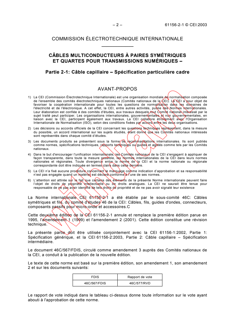 La Norme internationale CEI 61156-2-1 a été établie par le sous-comité 46C: Câbles