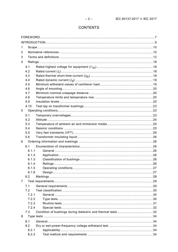 IEC 60137:2017 is a standard published by the International Electrotechnical Commission (IEC). Its full title is "Insulated bushings for alternating voltages above 1000 V". This standard covers: IEC 60137:2017 specifies the characteristics and tests for insulated bushings. This standard is applicable to bushings, as defined in Clause 3, intended for use in electrical apparatus, machinery, transformers, switchgear and installations for three-phase alternating current systems, having highest voltage for equipment above 1 000 V and power frequencies of 15 Hz up to and including 60 Hz. Subject to special agreement between purchaser and supplier, this standard may be applied, in part or as a whole, to the following: - bushings used in other than three-phase systems; - bushings for high-voltage direct current systems; - bushings for testing transformers; - bushings for capacitors. Special requirements and tests for transformer bushings in this standard apply also to reactor bushings. This standard is applicable to bushings made and sold separately. Bushings which are a part of an apparatus and which cannot be tested according to this standard should be tested with the apparatus of which they form part. This edition includes the following significant technical changes with respect to the previous edition: - Resin-impregnated synthetic (RIS) bushings has been introduced. - Bushings with Um ≤ 1,1 kV, Um = 1100 kV and Um = 1200 kV have been introduced. - Temperature rise testing has been included for liquid-insulated bushings according to clause to 3.4. - Introducing dry lightning impulse testing as a routine test for all transformer bushings with Um > 72,5 kV. - The altitude correction procedure has been revised ( > 1 000 m). - An explanation about Very Fast Transient (VFT) phenomenon and its impact on bushings has been included. The contents of the corrigendum of May 2018 have been included in this copy.
