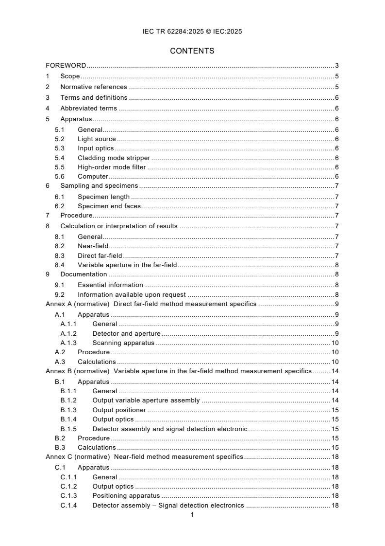 IEC TR 62284:2025 - Effective area measurements of single-mode optical fibres - is a Technical Report from the IEC that documents standardized methods for measuring the effective area (Aeff) of single‑mode optical fibres. The report defines three measurement methods - direct far-field (DFF), variable aperture in the far‑field (VAMFF) and near‑field (NF) - and gives common requirements, apparatus descriptions, procedures, calculation methods and documentation requirements. Method A (DFF) is defined as the reference method for dispute resolution and aligns with references in IEC 60793-1-45 and ITU‑T G.650.1.