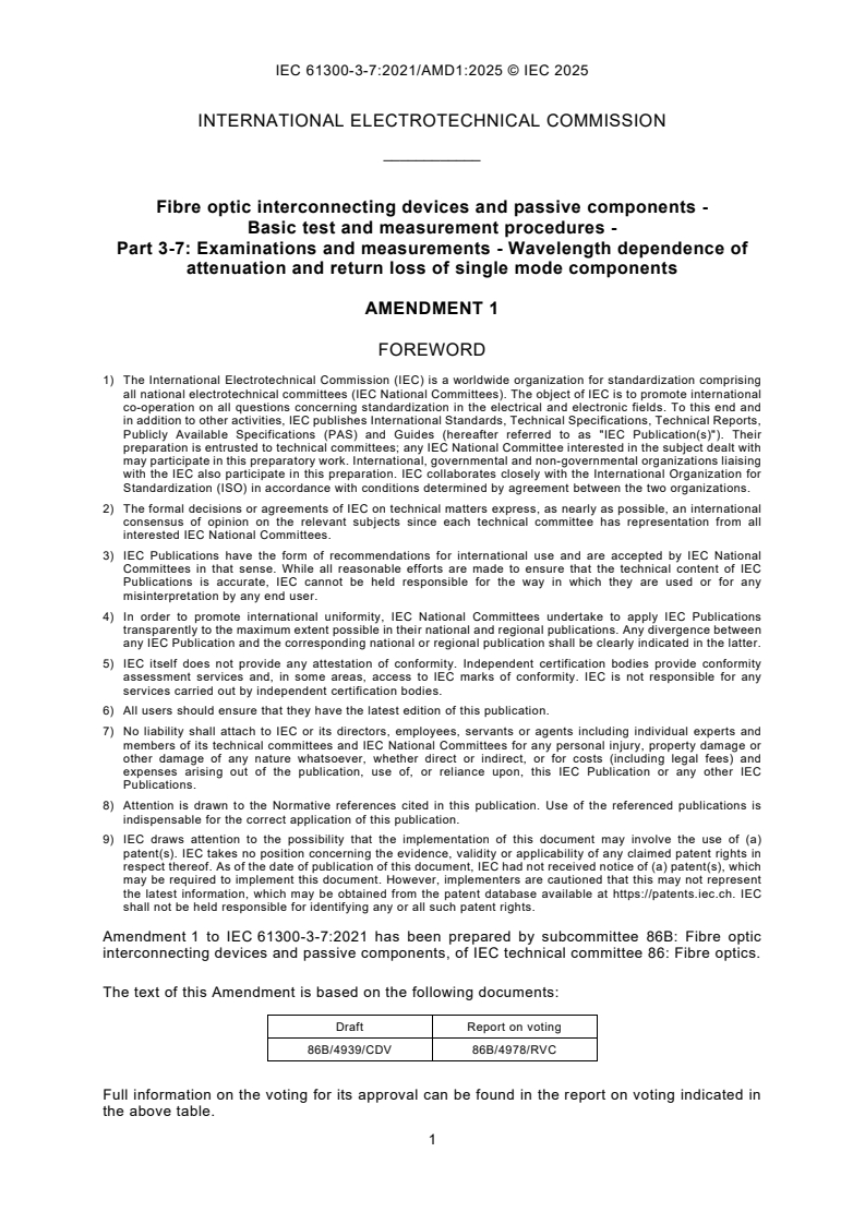 IEC 61300-3-7:2021/AMD1:2025 - Amendment 1 - Fibre optic interconnecting devices and passive components - Basic test and measurement procedures - Part 3-7: Examinations and measurements - Wavelength dependence of attenuation and return loss of single mode components Released:12. 12. 2025 Isbn:9782832709160