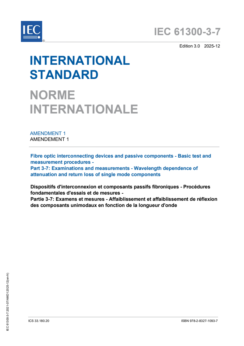 IEC 61300-3-7:2021/AMD1:2025 - Amendment 1 - Fibre optic interconnecting devices and passive components - Basic test and measurement procedures - Part 3-7: Examinations and measurements - Wavelength dependence of attenuation and return loss of single mode components Released:12/12/2025