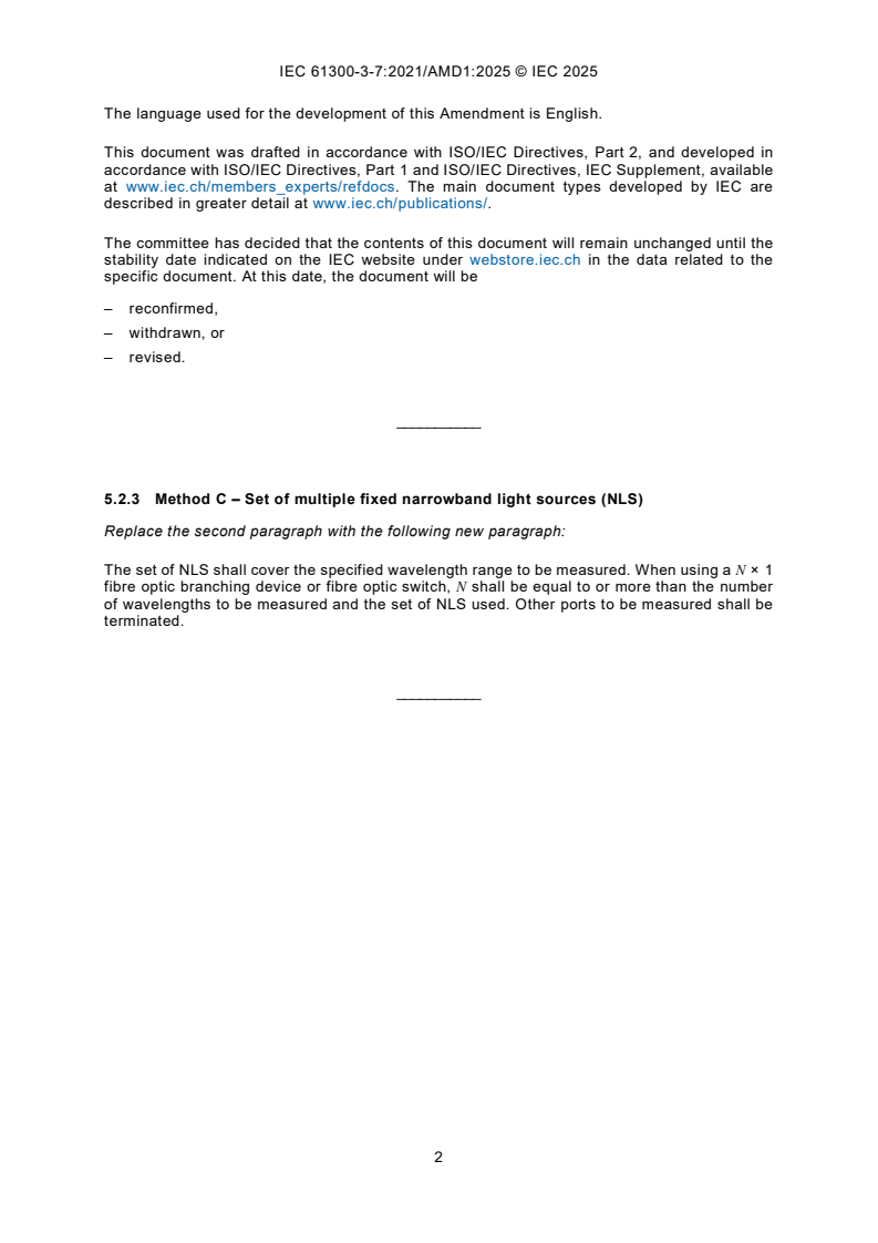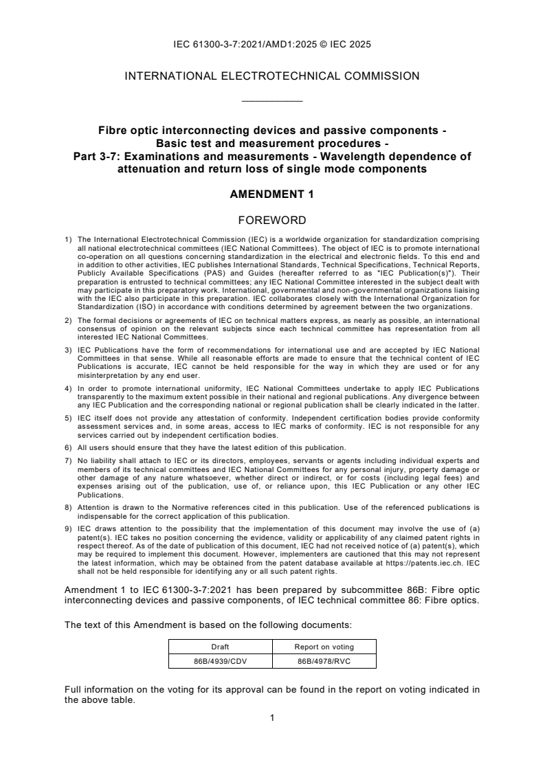 IEC 61300-3-7:2021/AMD1:2025 - Amendment 1 - Fibre optic interconnecting devices and passive components - Basic test and measurement procedures - Part 3-7: Examinations and measurements - Wavelength dependence of attenuation and return loss of single mode components