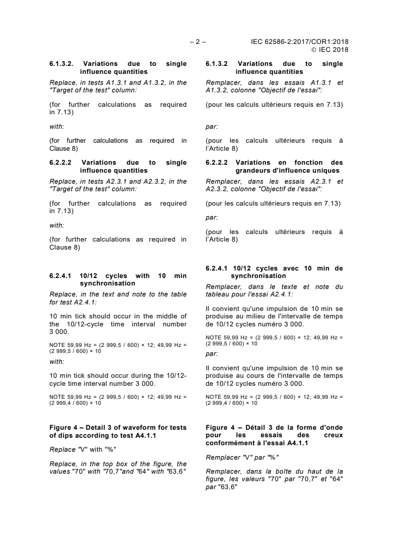 Corrigendum 1 - Mesure de la qualité de l'alimention dans les réseaux d'alimentation - Partie 2: Essais fonctionnels et exigences d'incertitude