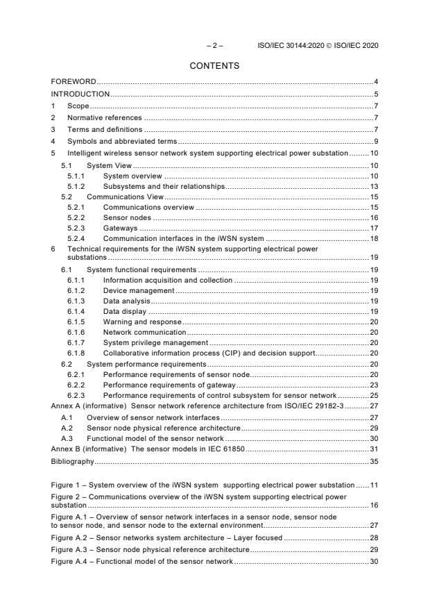 ISO/IEC 30144:2020 (E) specifies intelligent wireless sensor network (iWSN) from the perspectives of iWSN's system infrastructure and communications internal and external to the infrastructure, and technical requirements for iWSN to realize smart electrical power substations.