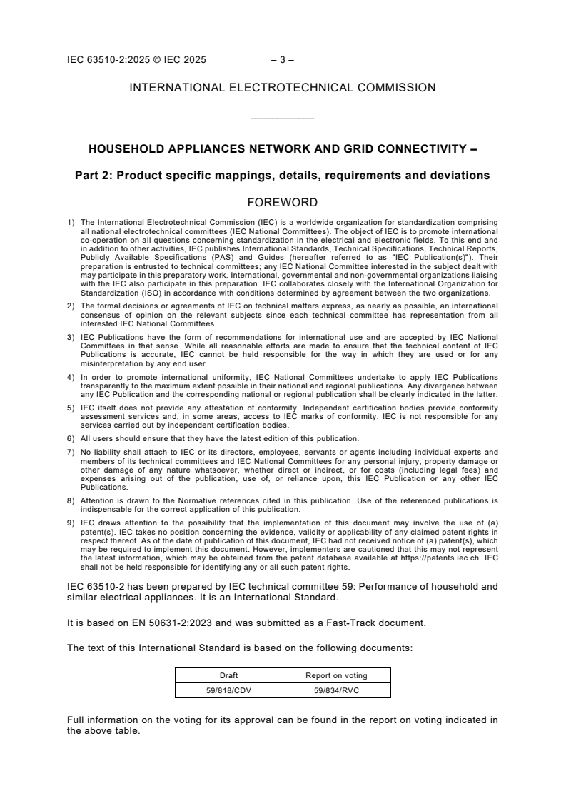 IEC 63510-2:2025 is a standard published by the International Electrotechnical Commission (IEC). Its full title is "Household appliances network and grid connectivity - Part 2: Product specific mappings, details, requirements and deviations". This standard covers: IEC 63510-2:2025 maps the generic use cases, use case functions, and generic data definitions to categories of appliances (e.g. washer, dishwasher, water heater, HVAC devices) as well as any necessary appliance-specific details and deviations. This document is part of the IEC 63510 series, which defines the information exchange between Smart Appliances and management systems in homes and buildings including energy management.