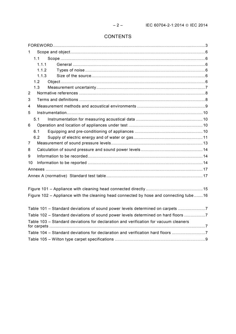 IEC 60704-2-1:2014 is a standard published by the International Electrotechnical Commission (IEC). Its full title is "Household and similar electrical appliances - Test code for the determination of airborne acoustical noise - Part 2-1: Particular requirements for vacuum cleaners". This standard covers: IEC 60704-2-1:2014 applies to electrical vacuum cleaners (including their accessories and their component parts) for household use in or under conditions similar to those in households. This part of IEC 60704 applies as it is to electrical vacuum cleaners operating in dry conditions. Some additions and modifications for vacuum cleaners operating in wet conditions are under consideration. How to test robotic vacuum cleaners is under consideration for a future edition. This part of IEC 60704 does not apply to vacuum cleaners for industrial or professional purposes. This third edition cancels and replaces the second edition published in 2000. This edition constitutes a technical revision. This edition includes the following significant technical changes with respect to the previous edition: a) introduction of a measuring method on hard floors; b) inclusion of values for measurement uncertainty; c) inclusion of values for standard deviation for declaration and verification; d) update of the definition of the standard test carpet. This publication is to be read in conjunction with IEC 60704-1:2010.