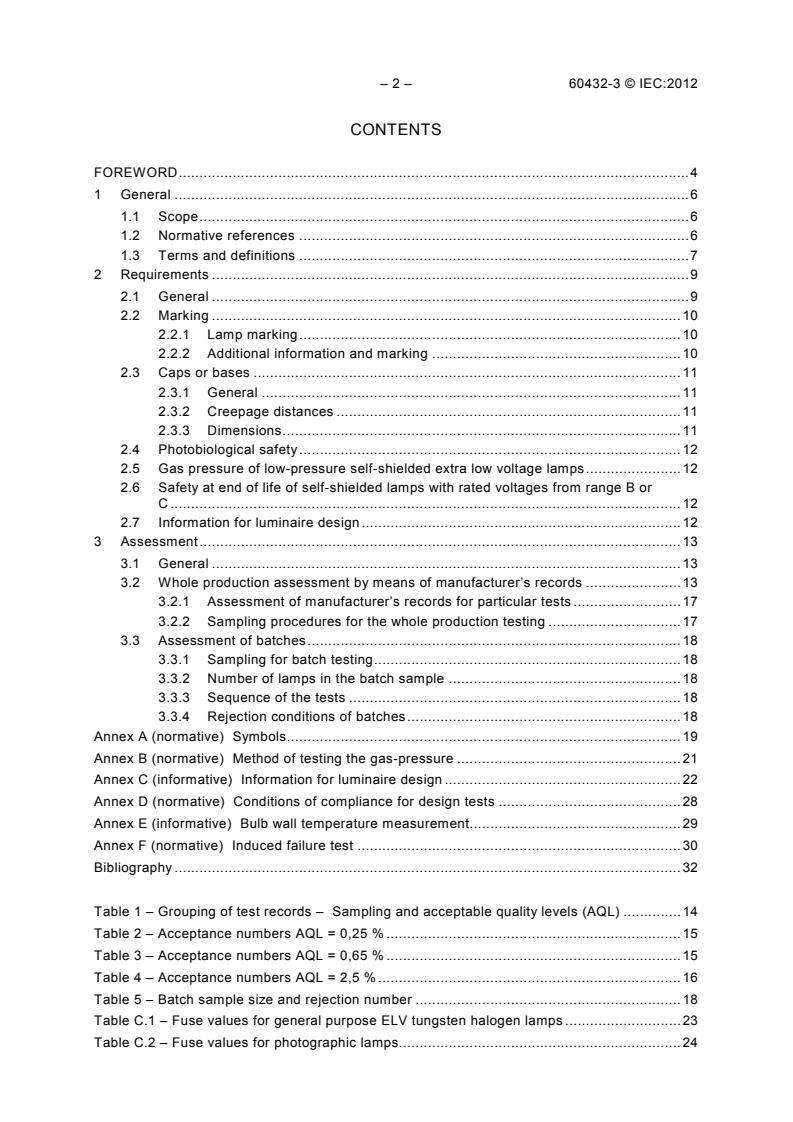 IEC 60432-3:2012 is an international standard established by the International Electrotechnical Commission (IEC) that specifies safety requirements for tungsten halogen incandescent lamps intended for non-vehicle applications. This second edition updates previous editions to align safety specifications with the current technology state, especially concerning cold fill pressure requirements and photobiological safety in accordance with IEC 62471.