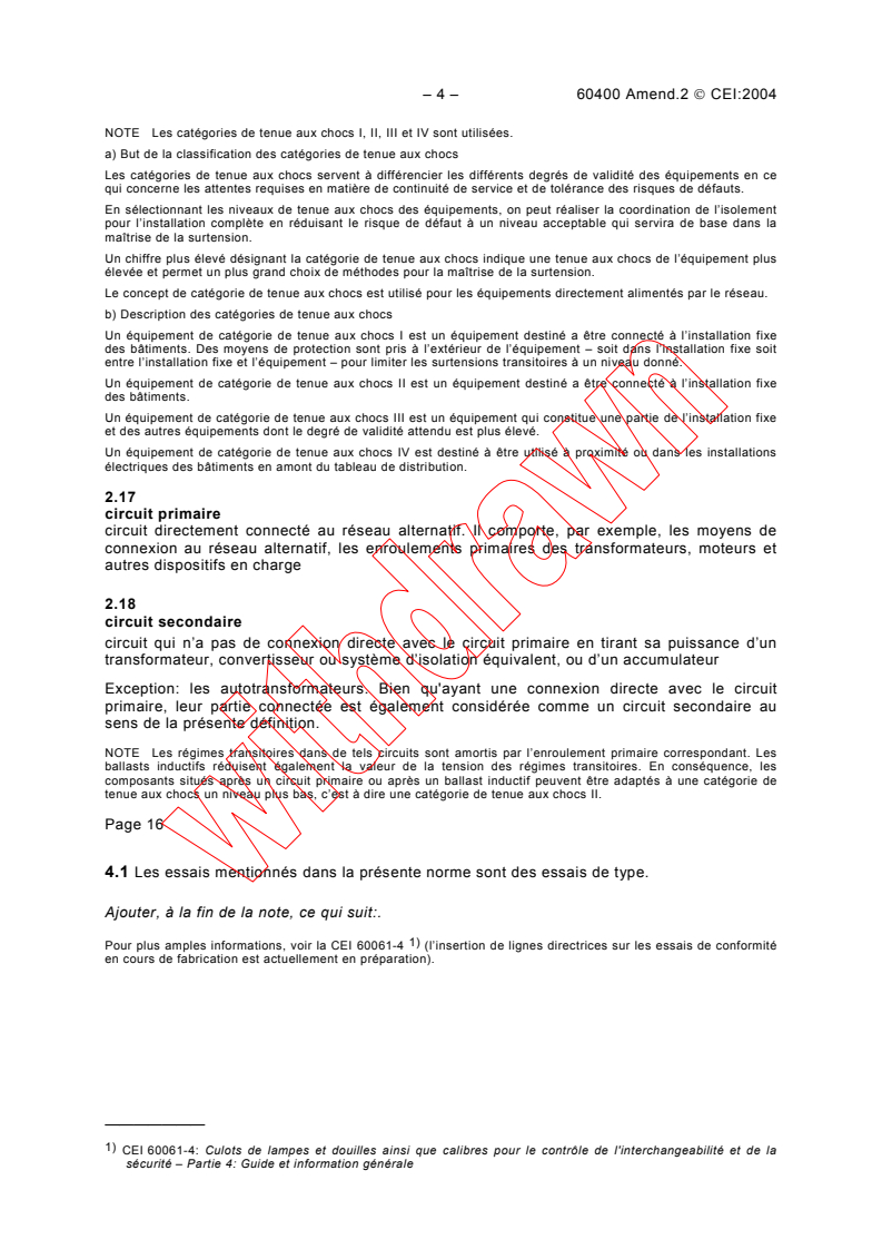 The amendment introduces and elaborates on impulse withstand categories (I, II, III, IV), which classify lampholders based on their ability to withstand transient overvoltages. This classification helps coordinate insulation across electrical installations to reduce risks of failure and enhance continuity of service:- Category I: Equipment connected to fixed building installations with external protection.
