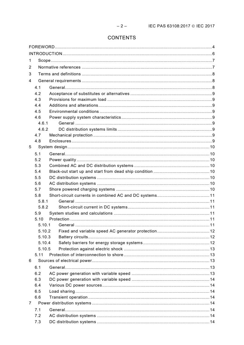 IEC PAS 63108:2017 is a technical specification published by the International Electrotechnical Commission (IEC). Its full title is "Electrical installation in ships - Primary DC distribution - System design architecture". This standard covers: IEC PAS 63108:2017 specifies the requirements of primary DC distribution systems and interconnected installations. The requirements of this PAS establish general principles for - operations, without degrading unit and human safety, capable of a reduced environmental footprint, - existing and new power generating units, new DC distribution concepts for electrical power, energy storage and advanced control of a total power balance, including semiconductor converters (AC to DC, DC to DC and DC to AC power converters) and dynamic load controllers, and - relevant system studies and calculations demonstrating a protection philosophy as needed for necessary selectivity, segregation methods and equipment. This PAS also gives guidelines for integration of energy sources of different nature and suitable ways to identify locations of such installations.