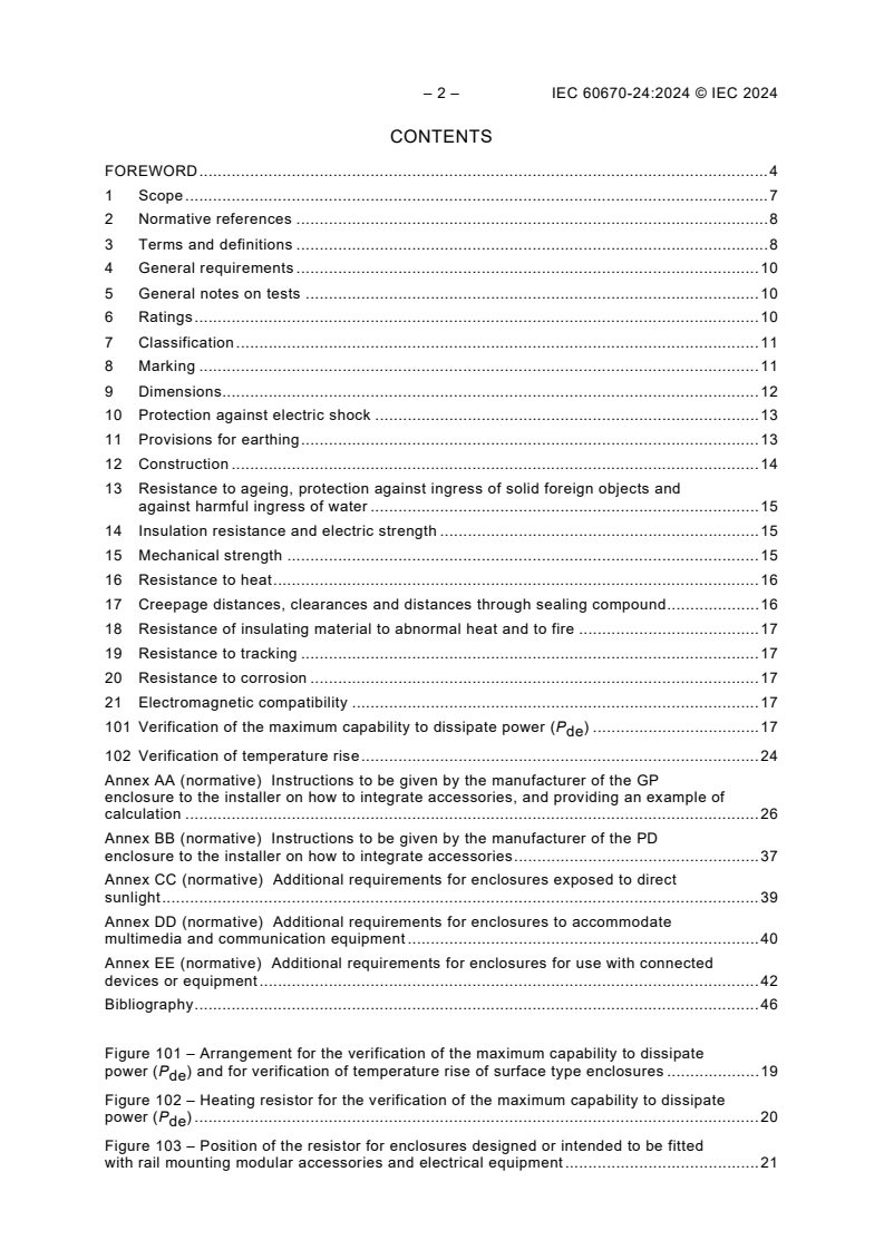 IEC 60670-24:2024 is a standard published by the International Electrotechnical Commission (IEC). Its full title is "Boxes and enclosures for electrical accessories for household and similar fixed electrical installations - Part 24: Particular requirements for enclosures for housing protective devices and other power dissipating electrical equipment". This standard covers: IEC 60670-24:2024 applies to enclosures and parts of them for housing protective devices and other power dissipating electrical equipment intended to be used with a rated voltage not exceeding 400 V and a total incoming load current not exceeding 125 A for household and similar fixed electrical installations. These enclosures are intended to be installed in locations where unskilled persons have access. They are intended to be equipped with electrical equipment by skilled persons (installers). These enclosures are intended to be installed where the prospective short circuit current does not exceed 10 kA unless they are protected by current limiting protective devices with a cut-off current not exceeding 17 kA. Enclosures complying with this document are suitable for use at ambient temperature not normally exceeding 40 °C, but their average temperature over a period of 24 h does not exceed 35 °C, with a lower limit of the ambient air temperature of −5 °C. This third edition cancels and replaces the second edition published in 2011. This edition constitutes a technical revision. This edition includes the following significant technical changes with respect to the previous edition: a) revision of requirements for protection against electric shock in Clause 10; b) addition of requirements for functional earthing in 11.101; c) revision of the requirements for fixing of flush type and semi-flush type enclosures in 12.12; d) revision of the requirements for resistance of insulating material to abnormal heat and to fire in Clause 18; e) addition of calculations to take into account the power loss of electronic devices in Clause AA.6; f) addition of tests and requirements for enclosures exposed to direct sunlight with the related Annex CC; g) addition of tests and requirements for enclosures with separate area to accommodate multimedia-equipment with the related Annex DD; h) addition of tests and requirements for enclosures used with connected devices or equipment with the related Annex EE.