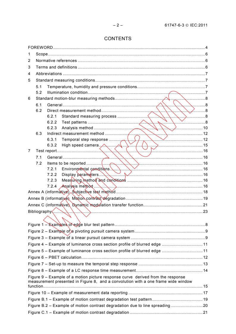 IEC 61747-6-3:2011 is a standard published by the International Electrotechnical Commission (IEC). Its full title is "Liquid crystal display devices - Part 6-3: Measuring methods for liquid crystal display modules - Motion artifact measurement of active matrix liquid crystal display modules". This standard covers: IEC 61747-6-3:2011 applies to transmissive type active matrix liquid crystal displays. This standard defines general procedures for quality assessment related to the motion performance of LCDs. It defines artifacts in the motion contents and methods for motion artifact measurement. NOTE: Motion blur measurement methods and analysis methods introduced in this standard could not be universal tools for all different LCD motion enhancement technologies due to its complexity. Users shall be notified of these circumstances.