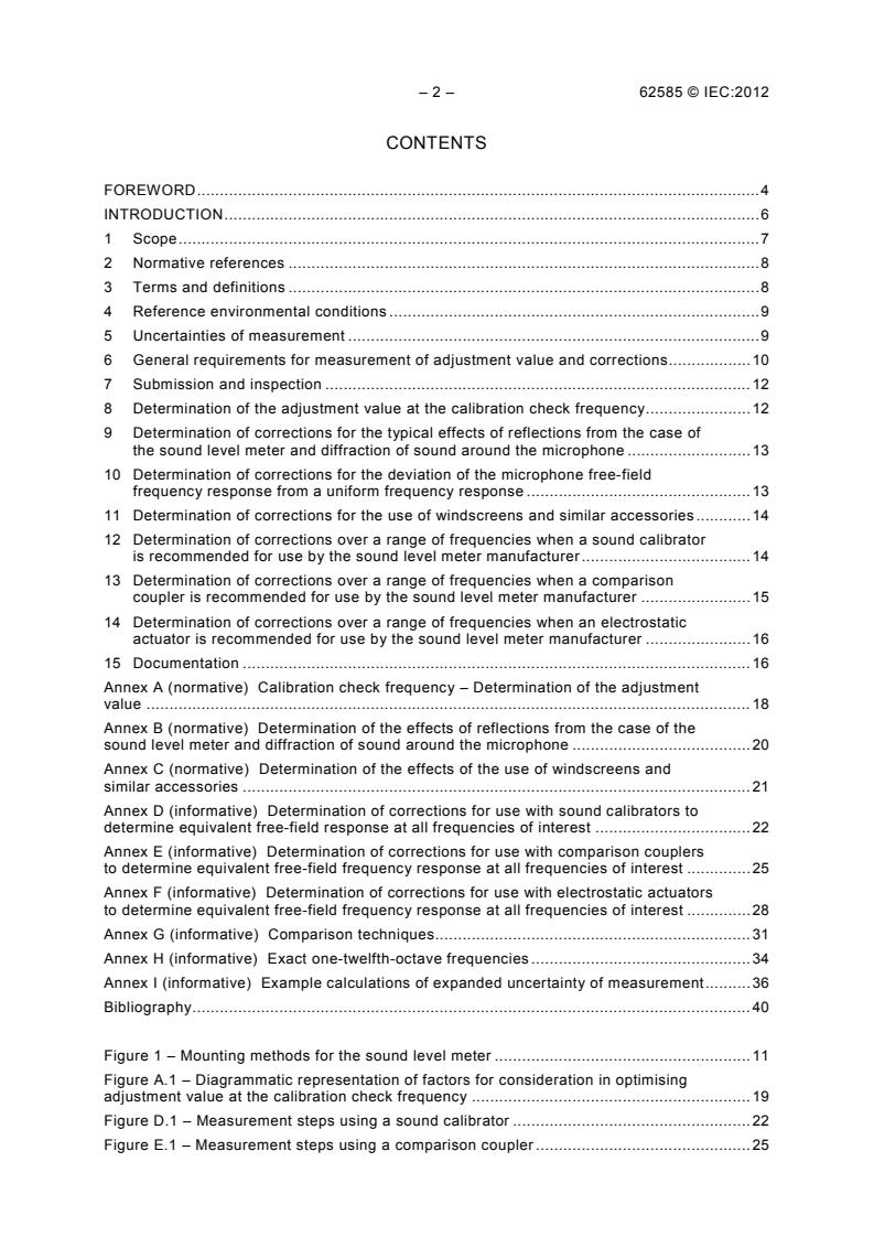 IEC 62585:2012 is a standard published by the International Electrotechnical Commission (IEC). Its full title is "Electroacoustics - Methods to determine corrections to obtain the free-field response of a sound level meter". This standard covers: IEC 62585:2012 provides information on the corrections required over a range of frequencies in order for a periodic test of a sound level meter to be performed according to IEC 61672-3. These corrections include; corrections for the typical effects of reflections from the case of the sound level meter and diffraction of sound around the microphone; corrections for the deviation of the typical microphone frequency response from a uniform frequency response, where the actual microphone response cannot be measured; and corrections for the influence on the frequency response of a typical microphone of a specified windscreen and any other accessory that is part of the configuration for normal use of the particular sound level meter submitted for testing. This International Standard includes discussion about uncertainties of measurement of the required corrections. In some instances a maximum permitted expanded uncertainty for the manufacturer or testing laboratory is given. The aim of this International Standard is to ensure that the adjustment value at the calibration check frequency and all corrections are determined using consistent and appropriate methods. It is intended that this International Standard will be used by manufacturers to determine adjustment values and corrections, by laboratories performing pattern evaluation tests according to IEC 61672-2, and by laboratories performing periodic tests according to IEC 61672-3. Laboratories performing periodic tests according to IEC 61672-3 will also need to consult this International Standard to ensure that the expanded uncertainties of measurement for the corrections quoted by the manufacturer do not exceed the maximum permitted values.