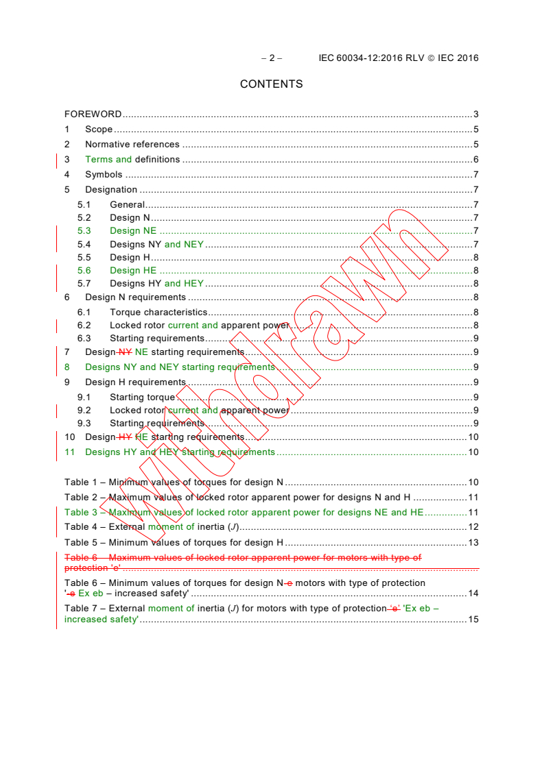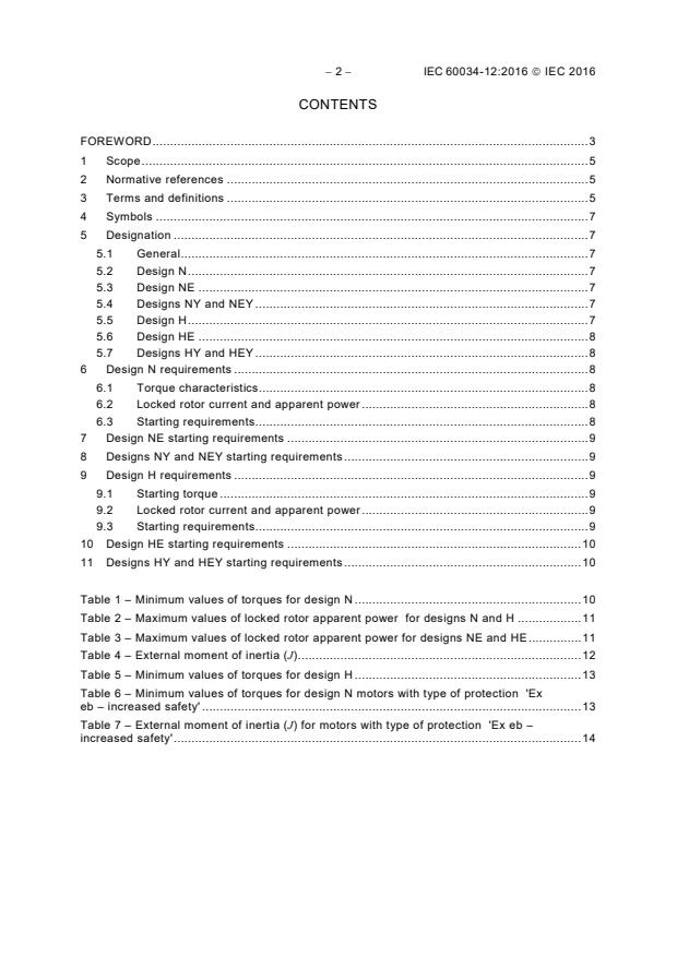 IEC 60034-12:2016 is a standard published by the International Electrotechnical Commission (IEC). Its full title is "Rotating electrical machines - Part 12: Starting performance of single-speed three-phase cage induction motors". This standard covers: IEC 60034-12:2016 specifies the parameters for eight designs of starting performance of single-speed three-phase 50 Hz or 60 Hz cage induction motors in accordance with IEC 60034-1 that: - have a rated voltage up to 1 000 V; - are intended for direct-on-line or star-delta starting; - are rated on the basis of duty type S1; - are constructed to any degree of protection and explosion protection. The main changes with respect to the previous edition are as follows: - new design letter E for extended efficiency motors, explanation of all design letters, and description of new designs NE, NEY, HE, and HEY; - addition of a reference to IEC 60079-7; - addition of a formula to calculate locked rotor current from apparent power.