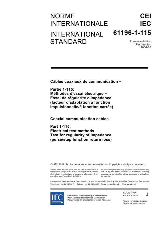 IEC 61196-1-115:2006 is a standard published by the International Electrotechnical Commission (IEC). Its full title is "Coaxial communication cables - Part 1-115: Electrical test methods - Test for regularity of impedance (pulse/step function return loss)". This standard covers: applies to coaxial communications cables. It specifies test methods for determining the regularity of impedance of coaxial cables for use in communications systems in the time domain.
