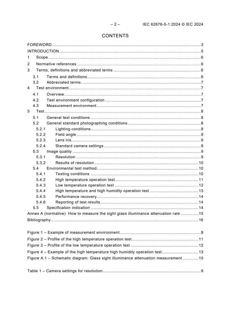 IEC 62676-5-1:2024 is a standard published by the International Electrotechnical Commission (IEC). Its full title is "Video surveillance systems for use in security applications - Part 5-1: Data specifications and image quality performance for camera devices - Environmental test methods for image quality performance". This standard covers: IEC 62676-5-1:2024 defines measuring methods for performance values of video surveillance camera equipment and defines image quality tests under the given temperature and humidity environment. This document is mainly targeting cameras with integrated lenses as the lenses are a major component that can impact the results. If the lens is selectable, the lens will be stated together with the results.