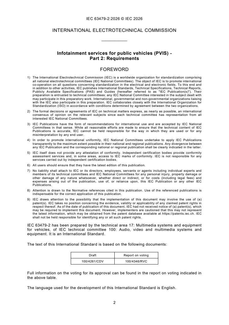 IEC 63479-2:2026 specifies the functional requirements for infotainment services for public vehicles (PVIS). Developed by the International Electrotechnical Commission (IEC), this international standard addresses the unique needs of infotainment in public transit environments such as buses, trains, and subways. PVIS aims to provide passengers with seamless access to multimedia content using both their personal and built-in vehicle devices, enhancing the user experience while optimizing resource usage and management across a wide range of public vehicle types.