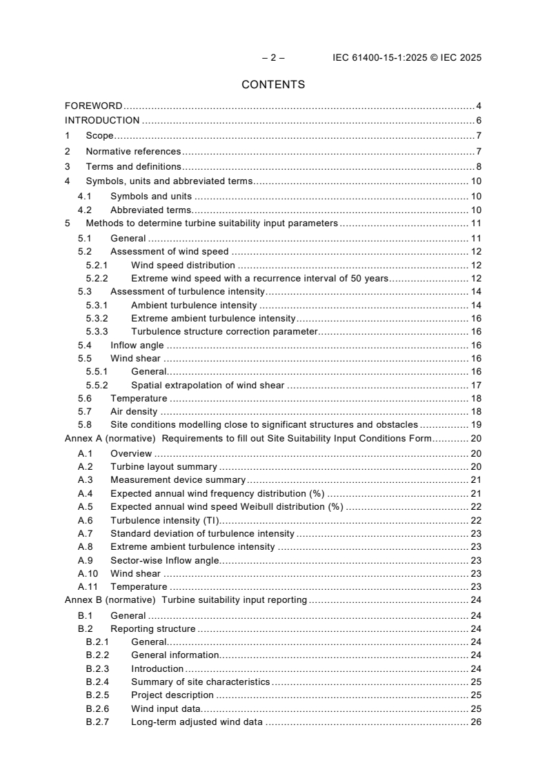IEC 61400-15-1:2025 is an international standard developed by the International Electrotechnical Commission (IEC) focused on wind energy generation systems. Specifically, it addresses the site suitability input conditions for wind power plants, covering both onshore and offshore installations. This standard establishes a comprehensive framework for the assessment and reporting of the meteorological and environmental inputs necessary to determine the suitability of a site for wind turbines.