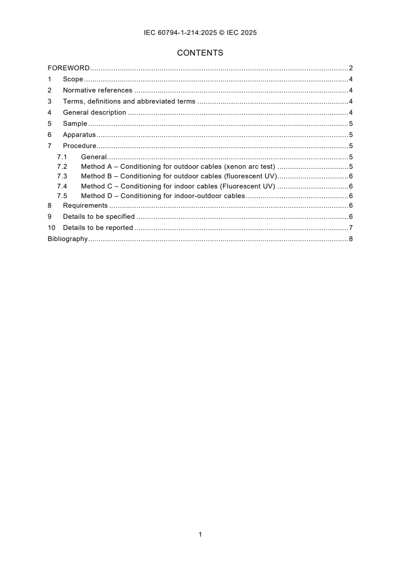 IEC 60794-1-214:2025 defines the test procedure used to measure the ability of cable sheath materials to maintain their integrity when exposed to ultraviolet (UV) radiation due to sunlight or fluorescent light. This first edition cancels and replaces Method F14 of the second edition of IEC 60794‑1‑22 published in 2017. This edition constitutes a technical revision. This edition includes the following significant technical changes with respect to IEC 60794‑1‑22:2017: a) addition of subclause as regards conditioning according to ISO 4892-2 or ISO 4892-3 for indoor-outdoor cables.