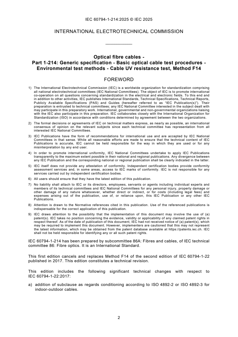 IEC 60794-1-214:2025 is a standard published by the International Electrotechnical Commission (IEC). Its full title is "Optical fibre cables - Part 1-214: Generic specification - Basic optical cable test procedures - Environmental test methods - Cable UV resistance test, Method F14". This standard covers: IEC 60794-1-214:2025 defines the test procedure used to measure the ability of cable sheath materials to maintain their integrity when exposed to ultraviolet (UV) radiation due to sunlight or fluorescent light. This first edition cancels and replaces Method F14 of the second edition of IEC 60794‑1‑22 published in 2017. This edition constitutes a technical revision. This edition includes the following significant technical changes with respect to IEC 60794‑1‑22:2017: a) addition of subclause as regards conditioning according to ISO 4892-2 or ISO 4892-3 for indoor-outdoor cables.