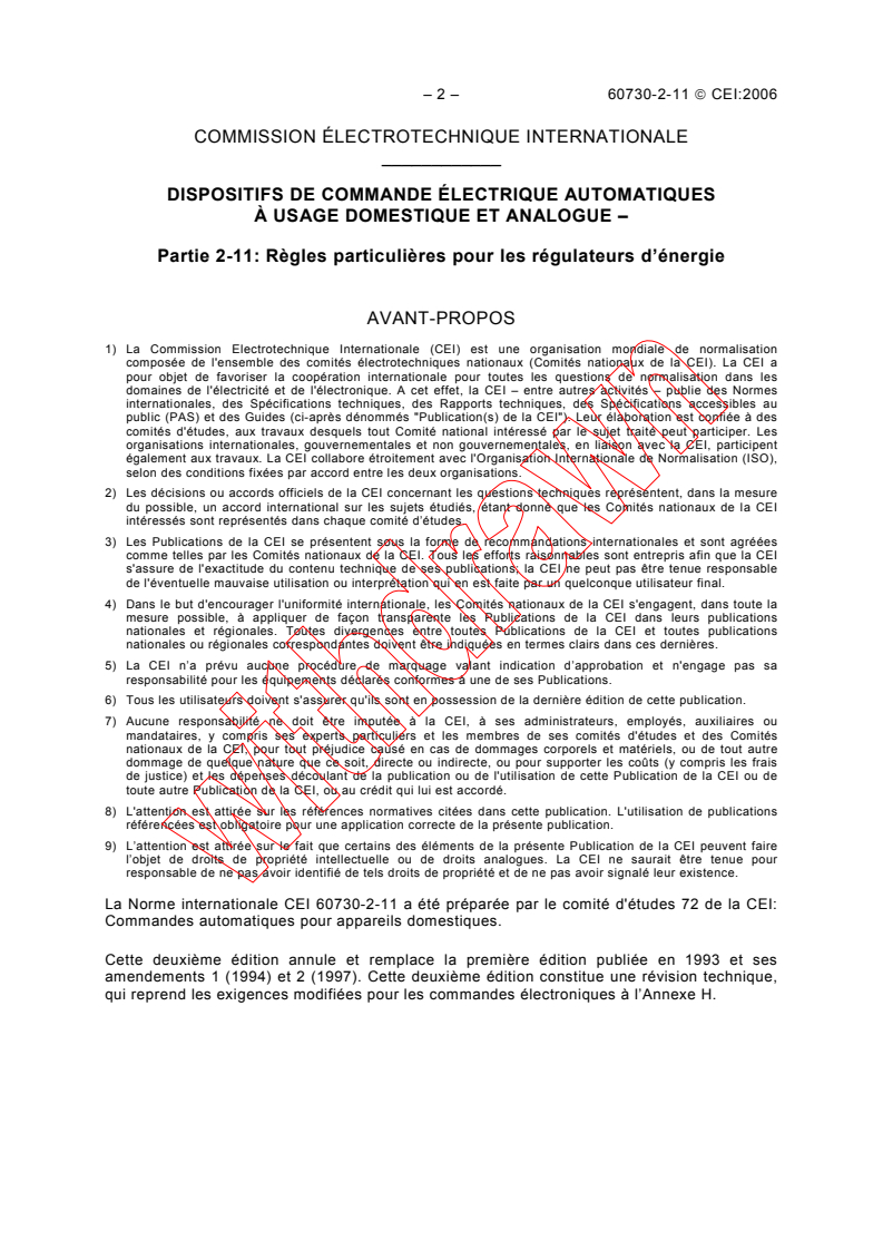 IEC 60730-2-11:2006 is an international standard developed by the International Electrotechnical Commission (IEC) that specifies the particular requirements for automatic electrical energy regulators intended for household and similar uses. This Part 2-11 is part of the IEC 60730 series, which covers automatic electrical controls used in domestic settings. It addresses energy regulators used in equipment for heating, air conditioning, and analogous applications that may utilize various energy sources such as electricity, gas, oil, solid fuels, solar thermal energy, or combinations thereof.