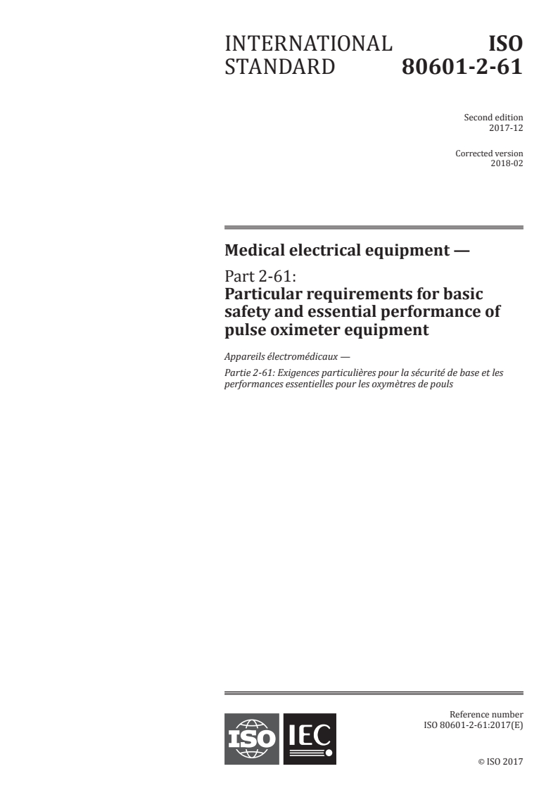 ISO 80601-2-61:2017 - Medical electrical equipment - Part 2-61: Particular requirements for basic safety and essential performance of pulse oximeter equipment Released:12/15/2017