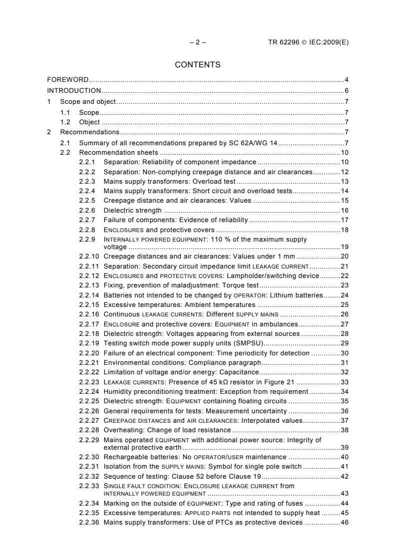 IEC/TR 62296:2009(E) contains a series of recommendations developed by an expert working group of IEC subcommittee 62A in response to questions of interpretation of the second edition of IEC 60601-1. IEC/TR 62296:2009(E) is primarily intended to be used by: - manufacturers of medical electrical equipment; - test houses and others responsible for assessment of compliance with IEC 60601-1:1988, and - those developing subsequent editions of IEC 60601-1. The recommendations in the first edition of IEC/TR 62296 were considered in preparing the third edition of IEC 60601-1. As the third edition of IEC 60601-1 has been published, some of the recommendations in the second edition of IEC/TR 62296 have been changed to align with requirements in IEC 60601-1:2005. Seven additional recommendations have been developed by IEC/SC 62A/WG 14 and are included in this edition of IEC/TR 62296. They are recommendations 57 through 63. This second edition cancels and replaces the first edition published in 2003. It constitutes a technical revision. This edition includes seven new recommendations: Recommendations 57 through 63. As the third edition of IEC 60601-1 has been published, some of the recommendations in this edition have been changed to align with requirements in IEC 60601-1:2005.