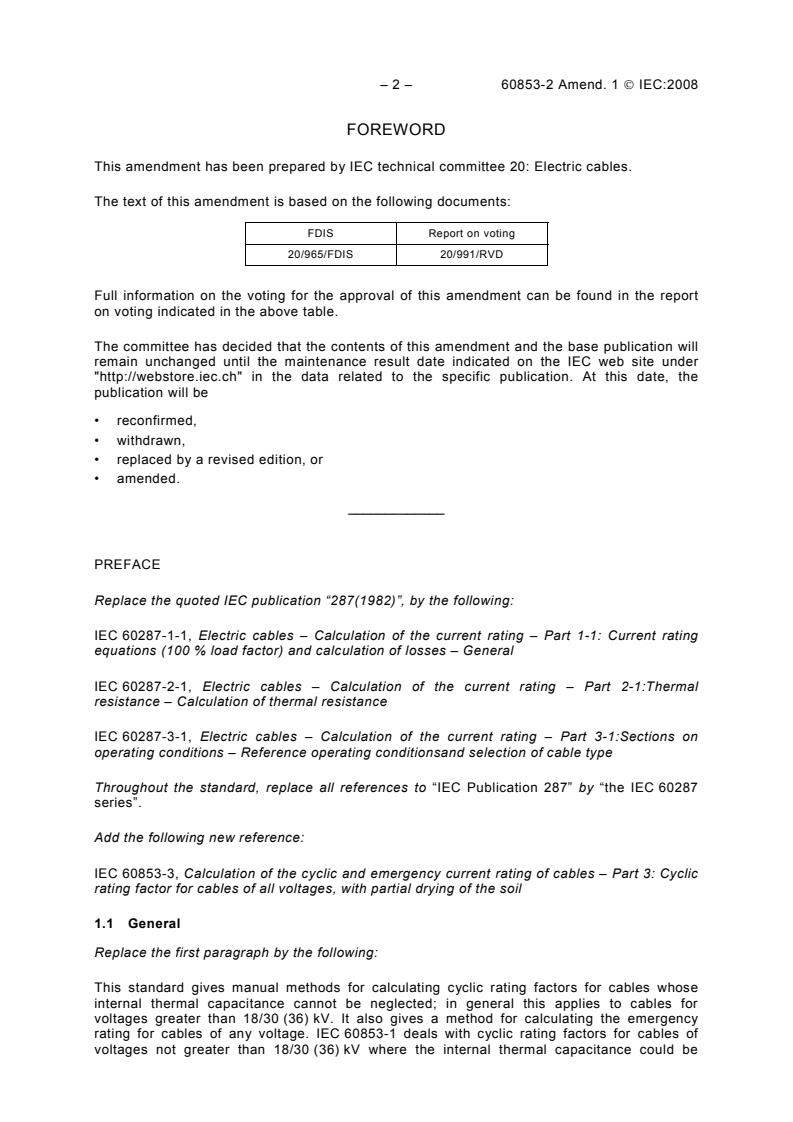 Amendment 1 - Calculation of the cyclic and emergency current rating of cables - Part 2: Cyclic rating of cables greater than 18/30 (36) kV and emergency ratings for cables of all voltages
