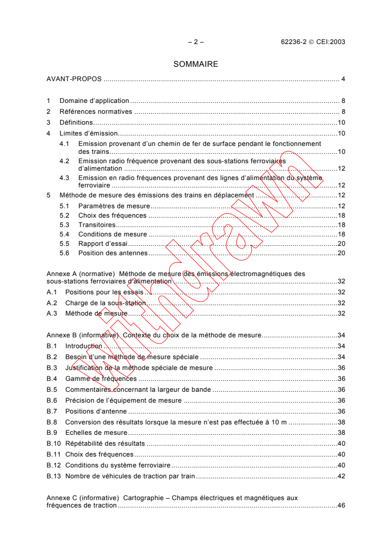 IEC 62236-2:2003 is a standard published by the International Electrotechnical Commission (IEC). Its full title is "Railway applications - Electromagnetic compatibility - Part 2: Emission of the whole railway system to the outside world". This standard covers: Sets the emission limits from the railway to the outside world at radio frequencies. Defines the applied test methods and gives information on typical field strength values at traction and radio frequency (cartography).