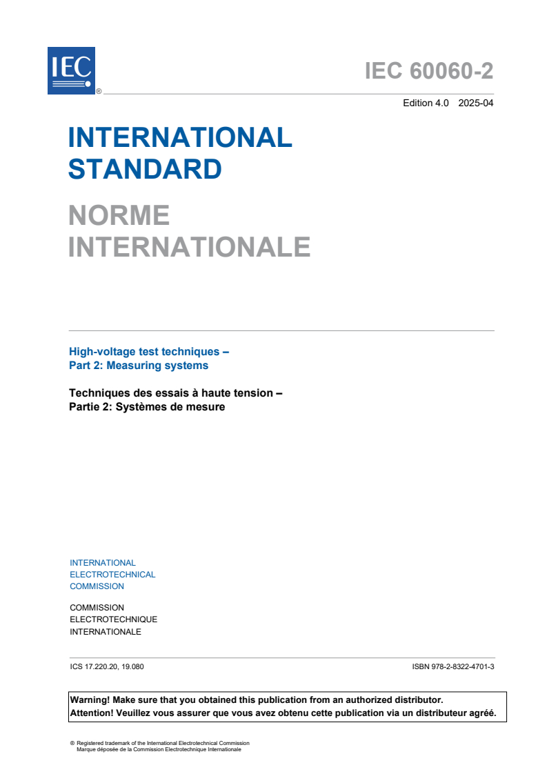 IEC 60060-2:2025, titled High-voltage test techniques - Part 2: Measuring systems, is an international standard published by the International Electrotechnical Commission (IEC). This fourth edition provides a comprehensive framework for the design, testing, calibration, and use of measuring systems specifically intended for high-voltage testing environments. It covers systems and components that measure direct voltage (DC), alternating voltage (AC), lightning impulse, switching impulse, and combined or composite voltages, as specified in IEC 60060-1.