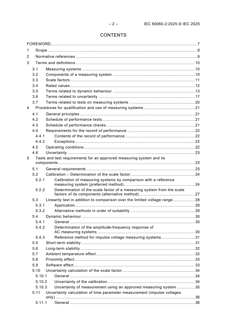 IEC 60060-2:2025 is applicable to complete measuring systems and to their components, used for the measurement of high voltages during laboratory and factory tests with direct voltage, alternating voltage and lightning and switching impulse voltages and combined and composite voltages as specified in IEC 60060-1. For measurements during on-site tests, see IEC 60060-3. The limits on uncertainties of measurements stated in this document apply to test levels stated in IEC 60071-1. The principles of this document apply also to higher levels but the uncertainty can be greater. This document: • defines the terms used; • describes methods to estimate the uncertainties of high-voltage measurements; • states the requirements that apply to measuring systems; • describes the methods for approving a measuring system and checking its components; • describes the procedures by which the user demonstrates that a measuring system meets the requirements of this document, including the limits set for the uncertainty of measurement. This fourth edition cancels and replaces the third edition published in 2010. This edition constitutes a technical revision. This edition includes the following significant technical changes with respect to the previous edition: a) The general layout and text has been updated and improved to make the standard easier to use. b) This document has been revised to align it with the fourth edition of IEC 60060-1. c) The treatment of measurement uncertainty estimation has been expanded. d) This document is now applicable to measuring systems used in testing at all standard insulation levels specified in IEC 60071-1. e) The measurement uncertainty requirement for the front time of the standard lighting impulse voltage has been changed from 10 % to 15 %, for testing at all standard insulation levels specified in IEC 60071-1. f) The parameter "time-to-peak" of the switching impulse defined in the third edition of IEC 60060-1:2010 has been replaced by "front time" in the fourth edition of IEC 60060-1. Necessary changes have been made in this document to accommodate this change in IEC 60060-1. g) Clause 10, Measurement of combined voltages and Clause 11, Measurement of composite voltages have been added. h) Clause B.1 has been significantly revised to align more closely with the provisions of Clause 5, including using the same nomenclature.