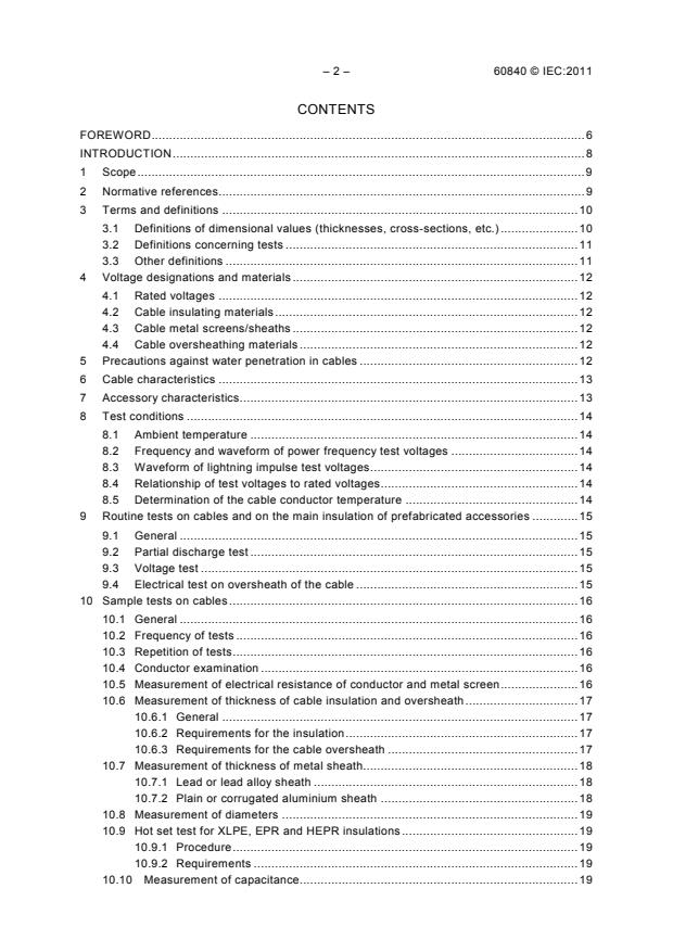 IEC 60840:2011 is a standard published by the International Electrotechnical Commission (IEC). Its full title is "Power cables with extruded insulation and their accessories for rated voltages above 30 kV (<em>U</em><sub>m</sub> = 36 kV) up to 150 kV (<em>U</em><sub>m</sub> = 170 kV) - Test methods and requirements". This standard covers: IEC 60840:2011 specifies test methods and requirements for power cable systems, cables alone and accessories alone, for fixed installations and for rated voltages above 30 kV (Um = 36 kV) up to and including 150 kV (Um = 170 kV). The requirements apply to single-core cables and to individually screened three-core cables and to their accessories for usual conditions of installation and operation, but not to special cables and their accessories, such as submarine cables, for which modifications to the standard tests may be necessary or special test conditions may need to be devised. This standard does not cover transition joints between cables with extruded insulation and paper insulated cables. The significant technical change with respect to the previous edition is as follows: - introduction of a prequalification test procedure for cables with high electrical stresses and tested as a cable system including accessories. NOTE: For a more detailed history of events leading up to this fourth edition, see the Introduction.