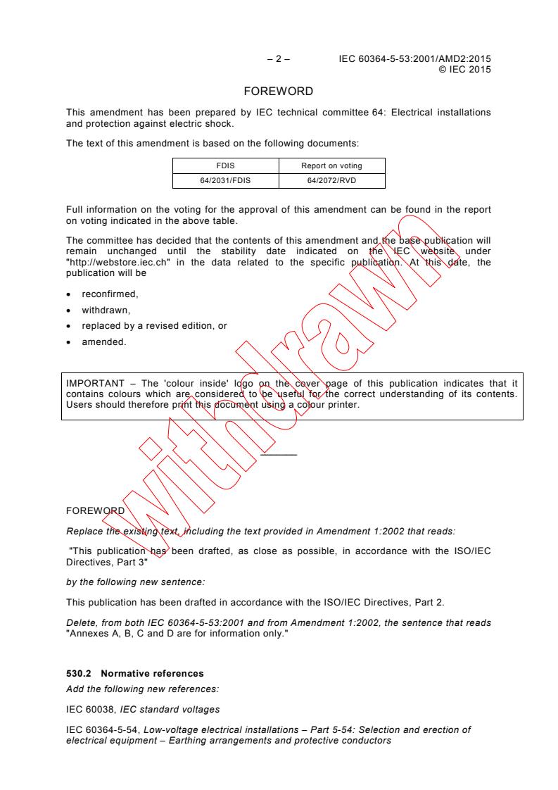 IEC 60364-5-53:2001/AMD2:2015 is an essential amendment to the IEC 60364 series, focusing on the selection and erection of electrical equipment related to isolation, switching, and control in electrical installations of buildings. Published by the International Electrotechnical Commission (IEC), it supplements the key requirements for ensuring electrical safety, reliability, and protection against transient overvoltages through proper device selection and installation methods.