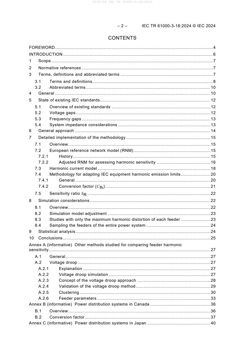 IEC TR 61000-3-18:2024 is a technical report published by the International Electrotechnical Commission (IEC). Its full title is "Electromagnetic compatibility (EMC) - Part 3-18: Limits - Assessment of network characteristics for the application of harmonic emission limits - Equipment connected to LV distribution systems not covered by IEC 61000-3-2 and IEC 61000-3-12". This standard covers: IEC TR 61000-3-18:2024 which is a technical report, reports on the development of a methodology for adapting IEC equipment emission limits from IEC 61000-3-2 and IEC 61000-3-12 for use in regions not covered by these documents. It identifies gaps in the existing equipment emission limit standards concerning their international applicability and identifies public power system characteristics important for the evaluation of harmonic voltage performance. The purpose of adapting the above-mentioned IEC equipment harmonic emission standards in a particular region is to maintain similar electromagnetic compatibility (EMC) of equipment up to 75 A per phase in the public power systems in those regions. NOTE The boundaries between the various voltage levels differ amongst different countries (see IEC 60050‑601:1985, 601-01-28). This document uses the following terms when referring to 50 Hz and 60 Hz system voltages: - low voltage (LV) refers to Un ≤ 1 kV; - medium voltage (MV) refers to 1 kV - high voltage (HV) refers to 35 kV EMC requirements can have economic and societal impacts; these have not been considered in the development of this document. The consideration of these factors generally occurs in the technical committees working on development and maintenance of emission limit standards.