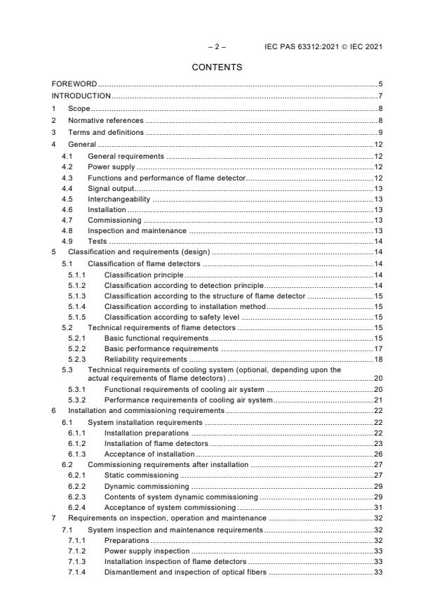 IEC PAS 63312:2021 deals with the general requirements, classification and technical requirements, installation and commissioning requirements, inspection and maintenance requirements, test methods and requirements of radiant energy sensing flame detectors (including IR, UV, visible light, and imaging-based flame detectors).
