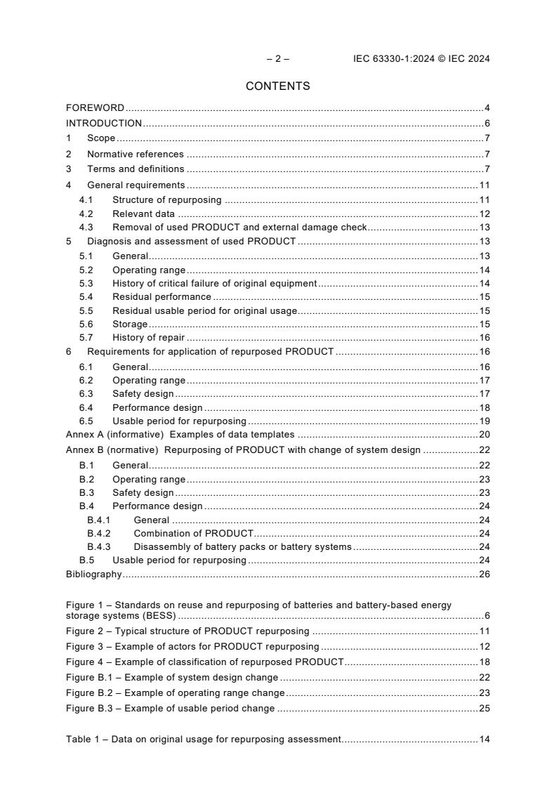 IEC 63330-1:2024 provides general requirements for repurposing of secondary cells, modules, battery packs and battery systems, herein also referred to as "PRODUCT", that are originally manufactured for other applications such as electric vehicles. This document specifies the procedure to evaluate the performance and safety of used PRODUCT for repurposing. This document also provides basic requirements for application of repurposed PRODUCT. This document targets secondary lithium ion PRODUCT and battery technologies with data traceability. This document intends to provide basic requirements and a procedure to evaluate the performance and safety of used batteries and battery systems, and also provide general requirements for application of repurposed batteries.