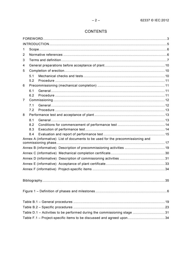 IEC 62337:2012는 공정 산업에서의 전기, 계기 및 제어 시스템의 프로젝트 진행과정에 대해 특정 단계와 이정표를 정의한다. 예를 들어, 이는 프로젝트의 "설치 완료" 이후와 소유주가 "공장 수락" 단계에 들어가기 전의 활동을 서술한다. 이러한 활동은 각 공정/공장 유형에 맞게 조정되어야 한다. 이 두 번째 판은 2006년에 출판된 첫 번째 판을 대체하며 기술적 수정을 포함한다. 이전 판과의 주요 변경 사항은 이 표준에서 언급된 문서의 정의가 향후 IEC 62708과 일치하도록 조정됐다는 것이다. 2012년 12월의 수정 내용도 이 판본에 포함되었다.