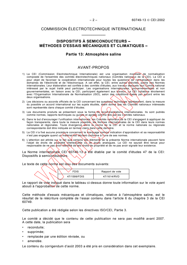 IEC 60749-13:2002 is a standard published by the International Electrotechnical Commission (IEC). Its full title is "Semiconductor devices - Mechanical and climatic test methods - Part 13: Salt atmosphere". This standard covers: Describes a salt atmosphere test that determines the resistance of semiconductor devices to corrosion. It is an accelerated test that simulates the effects of severe sea-coast atmosphere on all exposed surfaces. It is only applicable to those devices specified for a marine environment. The salt atmosphere test is considered destructive. The contents of the corrigendum of August 2003 have been included in this copy.