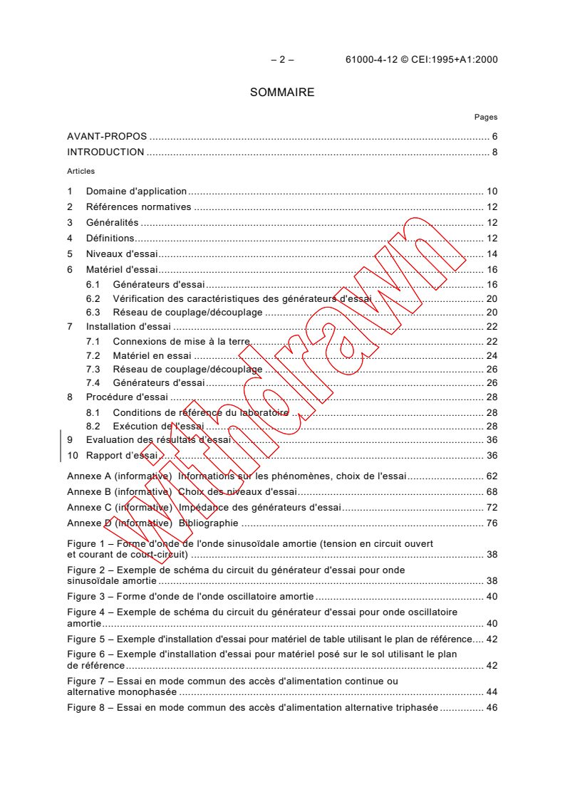 IEC 61000-4-12:1995 is a standard published by the International Electrotechnical Commission (IEC). Its full title is "Electromagnetic compatibility (EMC) - Part 4: Testing and measurement techniques - Section 12: Oscillatory waves immunity test. Basic EMC Publication". This standard covers: This basic standard establishes the immunity requirements and a common reference for evaluating in a laboratory the performance of electrical and electronic equipment intended for residential, commercial and industrial application, as well as of equipment intended for electrical stations, as applicable. The purpose of this standard is to define: - test voltage and current waveforms; - ranges of test levels; - test equipment; - test set-up; - test procedure.