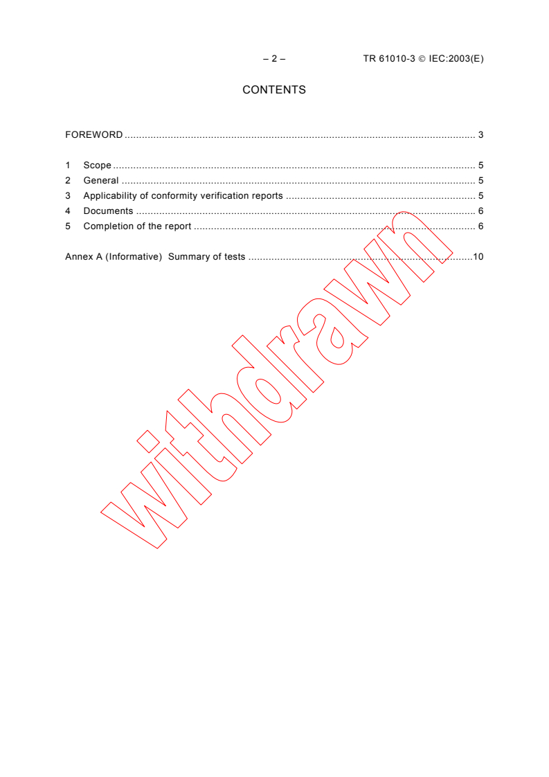 IEC TR 61010-3:2003 is a technical report published by the International Electrotechnical Commission (IEC). Its full title is "Safety requirements for electrical equipment for measurement, control, and laboratory use - Part 3: Protocol for the preparation of conformity verification reports for the IEC 61010 2nd edition series". This standard covers: This part of IEC 61010 is a technical report, which provides a test protocol to assist with determining and recording verification of conformity of the equipment under test with the reference documents identified on the front cover of the appropriate report.
