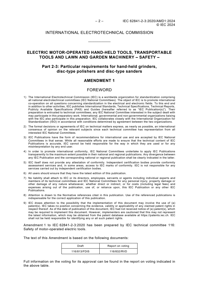 Keywords: IEC 62841-2-3 amendment 2024, hand-held grinder safety, disc-type polisher standards, disc-type sander requirements, electric motor-operated tools safety, concrete surface grinder guidelines, power tools international standards, IEC safety marking, tool operator protection, bonded abrasive product standards.
