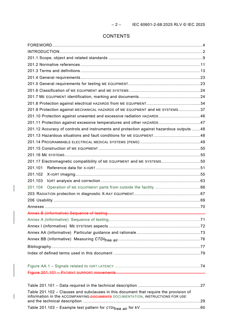 IEC 60601-2-68:2025 applies to the BASIC SAFETY and ESSENTIAL PERFORMANCE of X-ray based IMAGE-GUIDED RADIOTHERAPY equipment for use with EXTERNAL BEAM EQUIPMENT (EBE). This document covers safety aspects of kilovoltage (kV) and megavoltage (MV) X-ray imaging devices integrated in a specified geometrical relationship with EBE for the purpose of IGRT. It covers aspects of communication and relationships between the EXTERNAL BEAM EQUIPMENT and X-ray imaging devices, attached or not directly attached to, but in the same RADIATION shielded area as, and dedicated for use only with, the EXTERNAL BEAM EQUIPMENT. This document deals with equipment for OFFLINE X-IGRT, ONLINE X-IGRT and REAL-TIME X-IGRT. It covers procedures to reduce the risk of over-reliance on the X-IGRT EBE SYSTEM. For example, in the case of ONLINE X-IGRT, the MANUFACTURER will provide an interactive interface for user interaction with the correction suggested by the system. This document does not apply to CT SCANNERS, X-RAY EQUIPMENT for RADIOGRAPHY, and X-RAY EQUIPMENT for RADIOSCOPY, which are not intended for use for IGRT. Requirements that are being tested according to another standard can be identified by the manufacturer and if equivalent do not require retesting, instead evidence can refer to the CT SCANNER, X-RAY EQUIPMENT for RADIOGRAPHY, or X-RAY EQUIPMENT for RADIOSCOPY EQUIPMENT manufacturer's providing compliance statements or test reports. If the X-IGRT EQUIPMENT is combined with an MEE, any requirement that is the same for the X-IGRT EQUIPMENT and the MEE, such as a PATIENT POSITIONER, is not required to be tested twice, but can be accepted as tested by the MEE. This document applies for X-ray equipment for radiography, radioscopy, and COMPUTER tomography used for IGRT. If a clause or subclause is specifically intended to be applicable to X-IGRT EBE SYSTEMS, the content of that clause or subclause will say so. Where that is not the case, the clause or subclause applies only to X-IGRT EQUIPMENT. This document, with the inclusion of TYPE TESTS and SITE TESTS, applies respectively to the MANUFACTURER and some installation aspects of X-IGRT EBE SYSTEMS intended to be: • for NORMAL USE, operated under the authority of the RESPONSIBLE ORGANIZATION by QUALIFIED PERSONS having the required skills for a particular medical application, for particular specified clinical purposes, e.g., STATIONARY RADIOTHERAPY or MOVING BEAM RADIOTHERAPY, • maintained in accordance with the recommendations given in the INSTRUCTIONS FOR USE, and • subject to regular quality assurance performance and calibration checks by a QUALIFIED PERSON. IEC 80601-2-68:2024 cancels and replaces the first edition published in 2014. This edition constitutes a technical revision. This edition includes the following significant technical changes with respect to the previous edition: a) alignment with the new editions of the relevant standards: – IEC 60601-2-1:2020; – IEC 60601-2-44:2009, IEC 60601-2-44:2009/AMD1:2012 and IEC 60601-2-44:2009/AMD2:2016; – IEC 60601-2-64:2014; b) clarification of the use of IEC 60601-2-68 for CT SCANNERS, X-RAY EQUIPMENT for RADIOGRAPHY and RADIOSCOPY used in the same room with an EXTERNAL BEAM EQUIPMENT (EBE); c) introduction of updated requirements related to MECHANICAL HAZARDS, RADIATION HAZARDS, PROGRAMMABLE ELECTRICAL MEDICAL SYSTEMS (PEMS), ACCOMPANYING DOCUMENTATION of an ME SYSTEM, and REMOTE OPERATION.