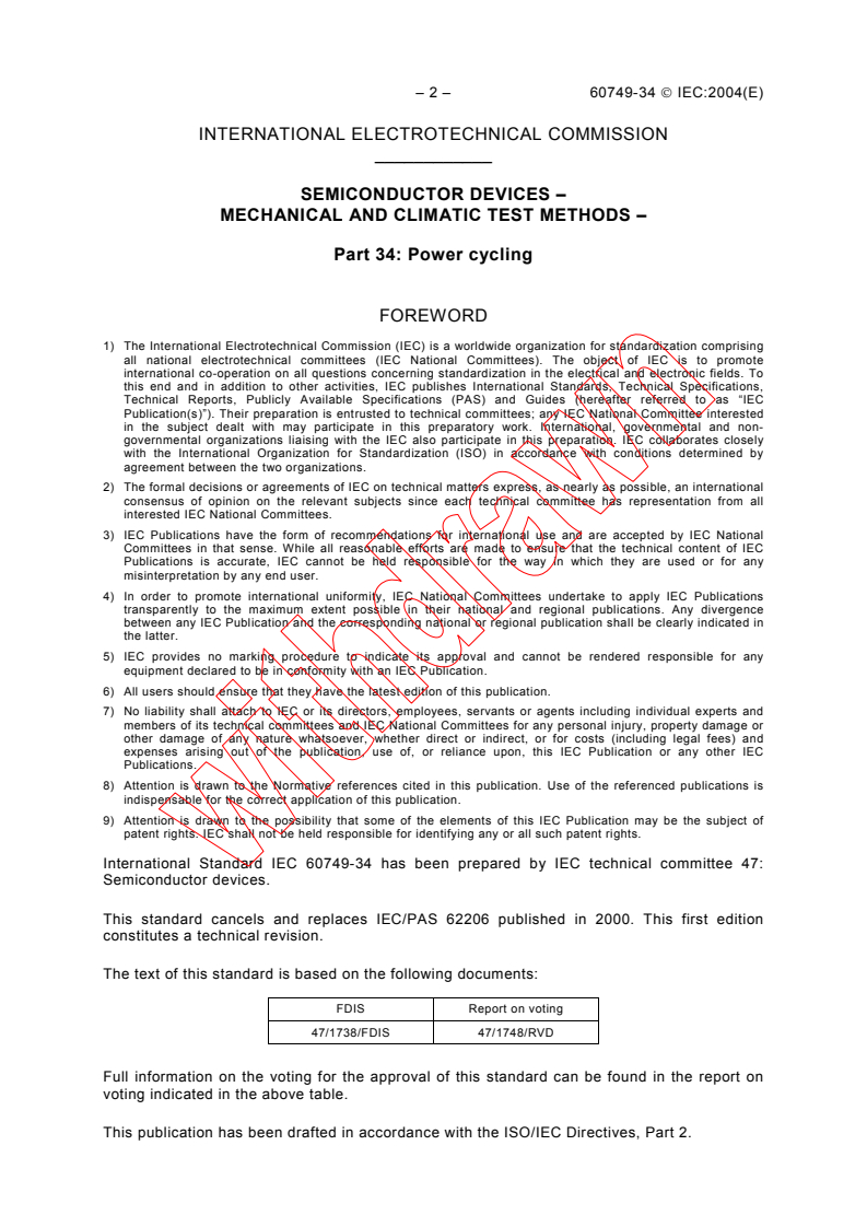IEC 60749-34:2004 is a standard published by the International Electrotechnical Commission (IEC). Its full title is "Semiconductor devices - Mechanical and climatic test methods - Part 34: Power cycling". This standard covers: Used to determine the resistance of a semiconductor device to thermal and mechanical stresses due to cycling the power dissipation of the internal semiconductor die and internal connectors. This happens when low-voltage operating biases for forward conduction (load currents) are periodically applied and removed causing rapid changes of temperature. The power cycling test is complementary to high temperature operating life.