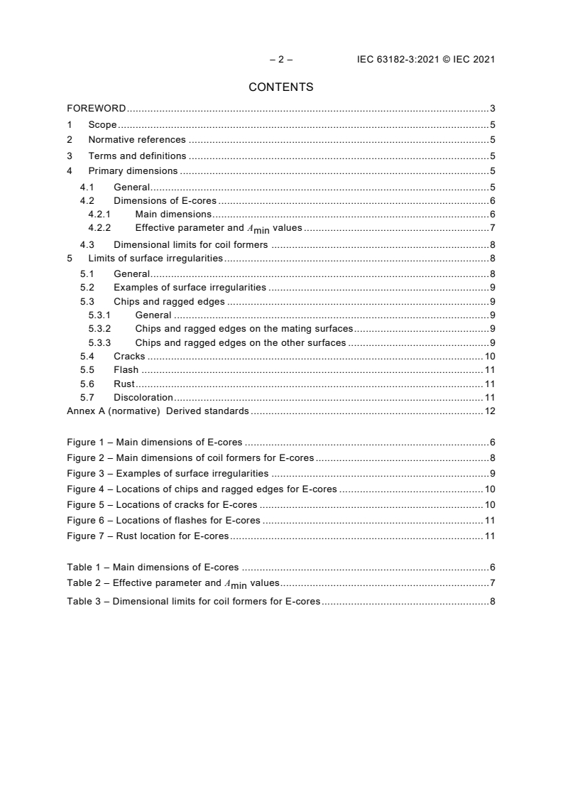 The standard provides calculated effective magnetic and geometric parameters (such as effective magnetic path length and cross-sectional area) to be used in magnetic and electrical circuit calculations, referencing IEC 60205 for calculation methods.Surface Irregularities Limits