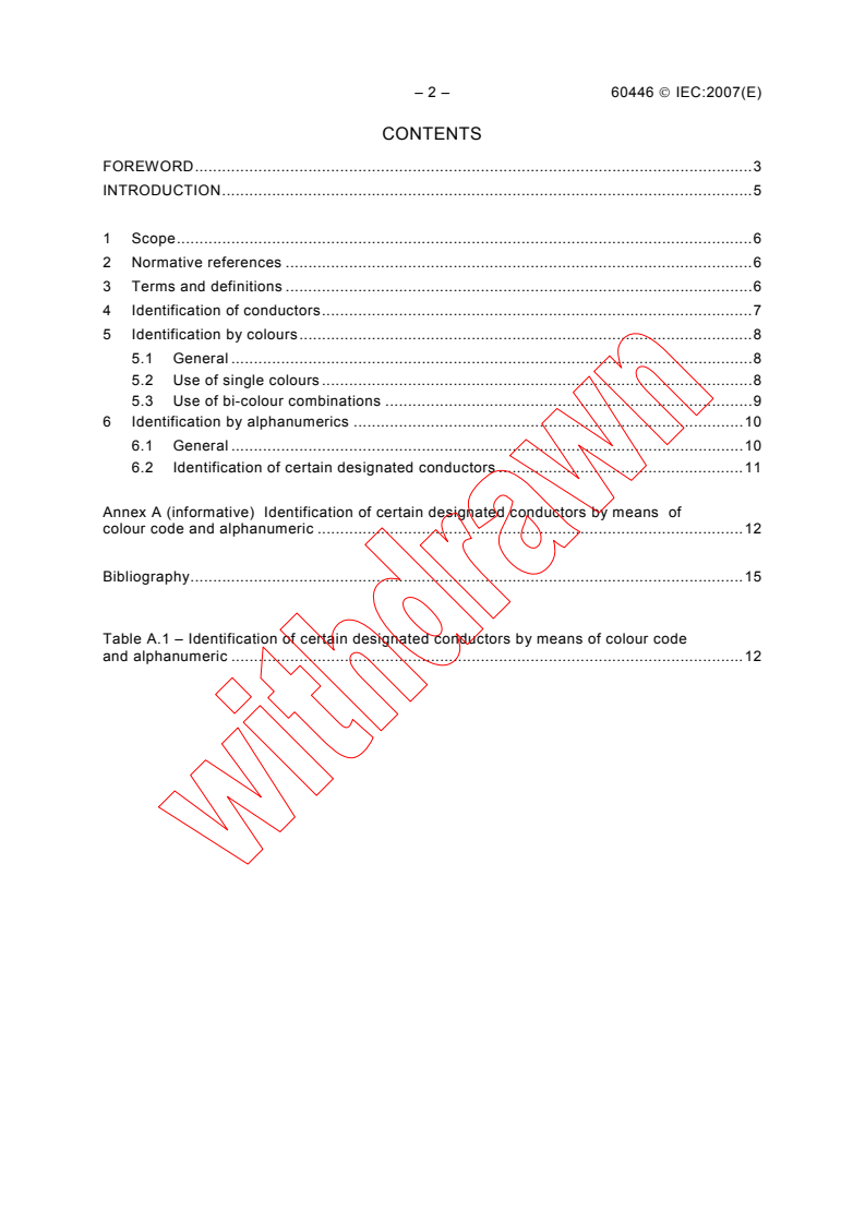 - addition of a new Annex A (informative) "Identification of certain designated conductors by means of colour code and alphanumeric"; - deletion of the old Annex A (informative) "Methods of marking PEN conductors in different countries". This bilingual version (2014-04) corresponds to the monolingual English version, published in 2007-05. It has the status of a basic safety publication in accordance with IEC Guide 104.