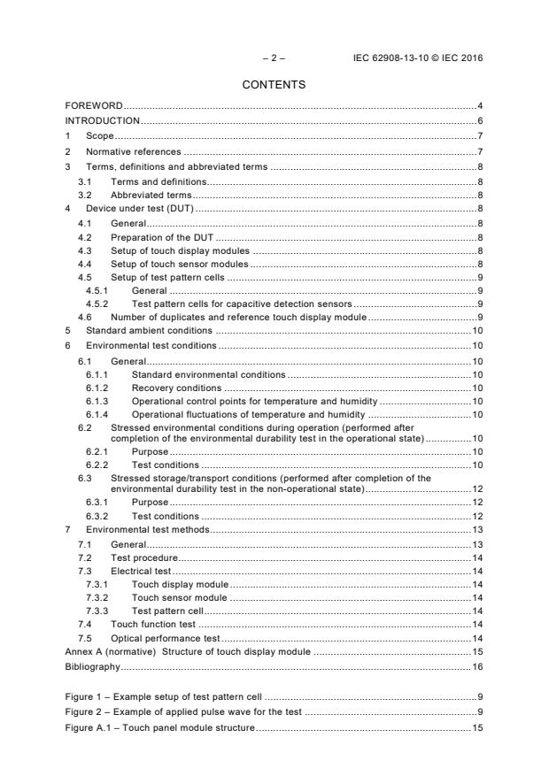IEC 62908-13-10:2016(E) specifies the methods for testing the environmental durability of touch display modules, touch sensor modules and test pattern cells, and can be used for devices at the production level, the prototype level or the trial model level when they are exposed to environmental stress. This document is applicable for touch displays that use capacitive or resistive detection sensors. It may also be applicable to other types of sensors as well as to touch display modules with both flat and flexible displays.