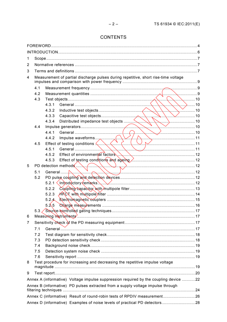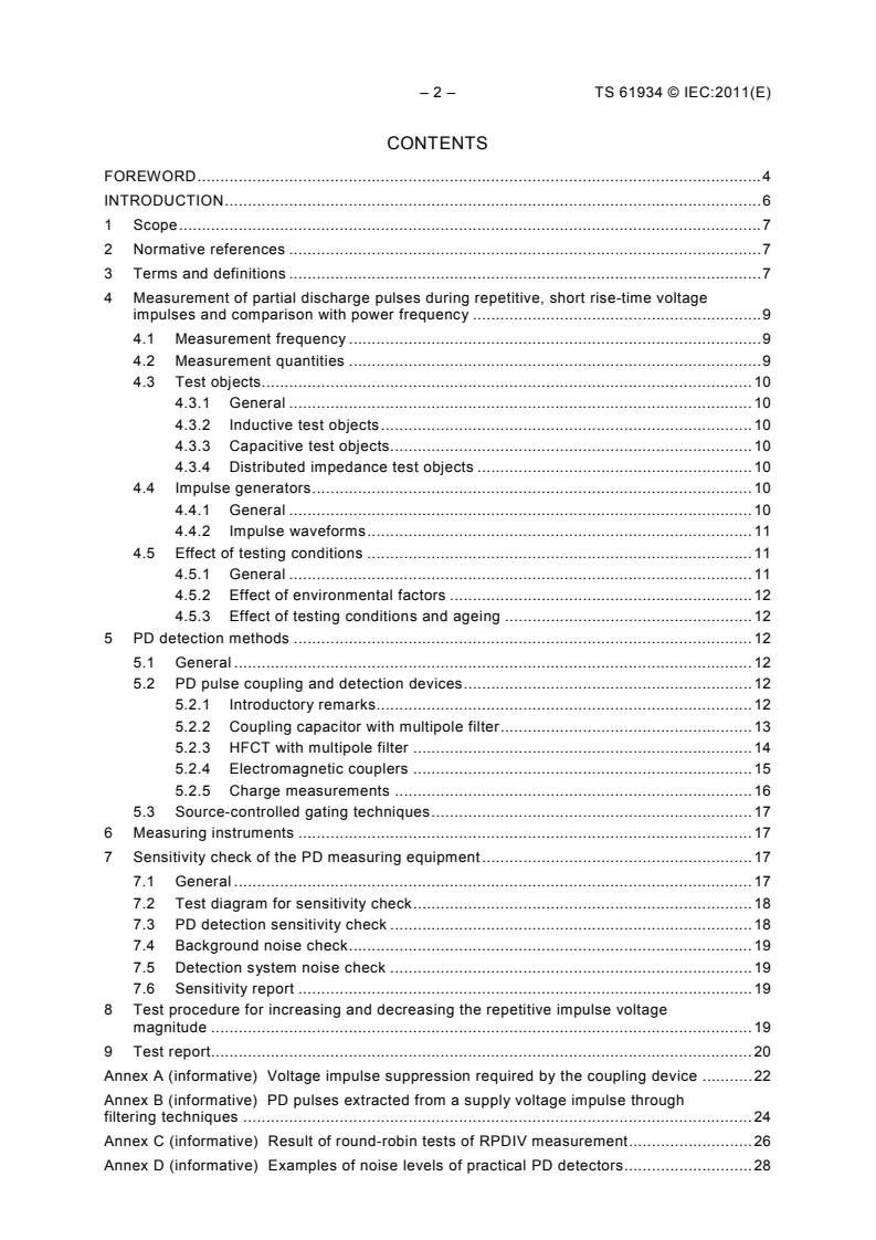- Informative annexes: Annex C - round‑robin test (RRT) practical experience; Annex D - example noise-levels for PD detectors; Annex A/B - filtering and suppression strategies.