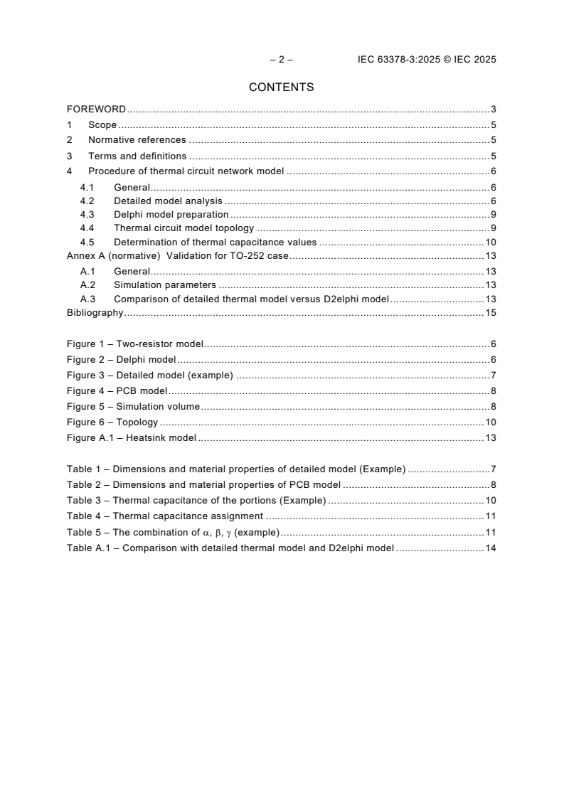 IEC 63378-3:2025 is an international standard developed by the International Electrotechnical Commission (IEC) that specifies thermal circuit network models for discrete semiconductor packages-specifically TO-243, TO-252, and TO-263 types. These models focus on transient thermal analysis, enabling precise estimation of junction temperatures in electronic devices without the need for experimental verification. This standard is targeted primarily at semiconductor suppliers for creating thermal models, which assembly makers of electronic devices can then use.